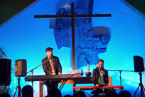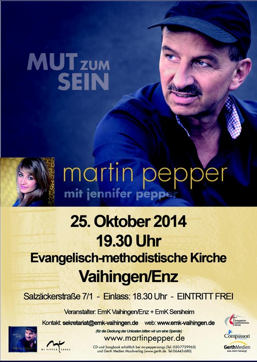 „Mut zum Sein“ so der Titel des Konzerts von Martin Pepper, das er gemeinsam mit seiner Tochter Jennifer am 25. Oktober 2014 in der Evangelisch-methodistischen Kirche in Vaihingen gab. Das Konzert begann mit dem Lied „Willkommen im Land der Begegnung“. Begegnung war verschiedentlich möglich an diesem Abend. Begegnung mit den anderen Besucher, Begegnung durch die Lieder und Texte mit sich selbst und natürlich Begegnung mit unserem Gott, der uns Mut zum Sein macht. In den Liedern, Gedichten und Gedanken während des Abends kam immer wieder zum Ausdruck, dass Gott uns in unsere heutigen Welt und Situationen in denen wir leben nahe ist, als der der Mut macht, tröstet, ermutigt begleitet und uns liebt. Neben den Inhalten der Lieder überzeugten Vater und Tochter Pepper durch ihre Stimmen und die musikalische Begleitung, so dass unter den über 200 Besuchern eine gute Stimmug aufkam. Den Abschluss des Konzerts bildetet zwei der bekanntesten Pepper-Lieder „Rückenwind“ und „Auge im Sturm“ die noch einmal zusammenfassten, dass Gott uns nahe ist, in allen Herausforderungen unseres Lebens.