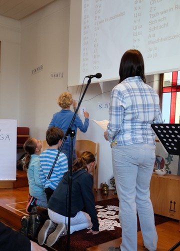 Auch die kyrillische Schrift haben wir uns näher angesehen und versucht für den Satz SLAVA NA BOGA (= Preiset den Herrn/Gott sei Dank) die kyrillischen Buchstaben aus dem Alphabet herauszufinden.