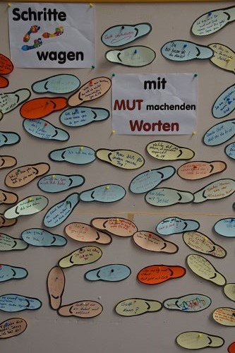 Fußspuren: schon beim Halleneintritt waren welche an die Pinwand zu heften – Fußabdrücke auf Papier mit Mut machenden Ideen der Besucher.