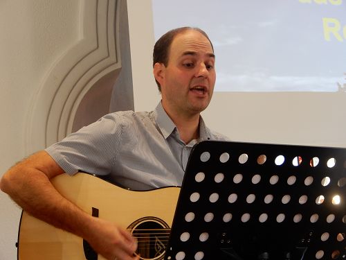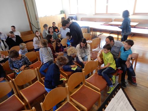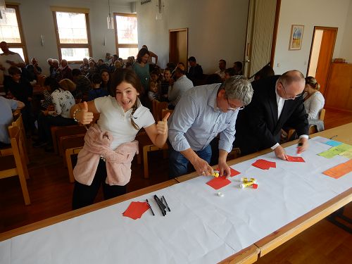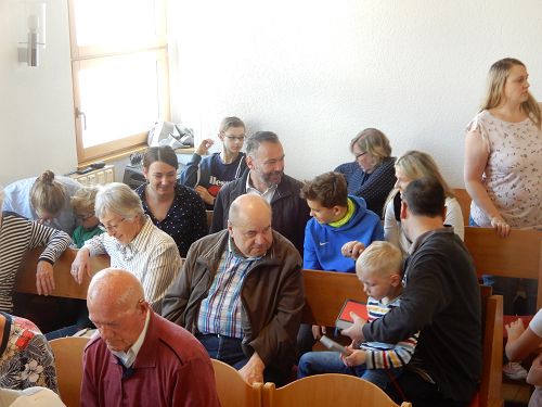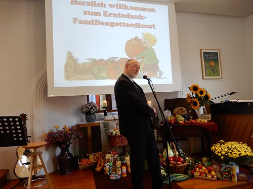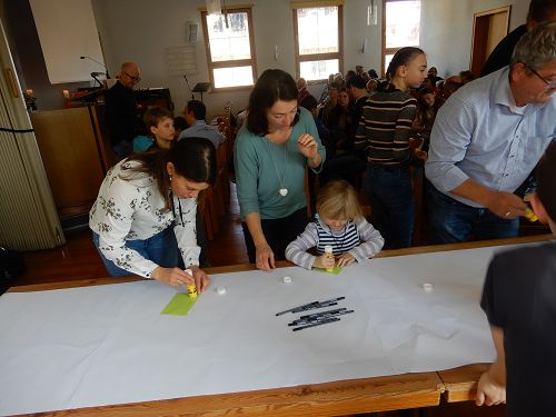 Die im Vorfeld von der Gemeinde zusammengetragenen Erntegaben aus der Gemeinde waren mit viel Kreativität und Liebe zu einem schönen Erntetisch aufgebaut worden. „Einfach spitze, dass du da bist“ ertönte es dann vielstimmig zum Beginn des abwechslungsreich gestalteten Gottesdienstes. Tobias Schmitt und seine Frau Tabea schafften es immer wieder, mit schwungvollen Liedern Bewegung in die Gemeinde zu bringen. Bei einer gemeinsamen Aktion durften dann alle auf Zettel schreiben wofür sie besonders dankbar waren, mit einer ganz besonderen Herausforderung: die aufgeschriebenen Dinge mussten die Farbe der Zettel haben, also rot, gelb grün…