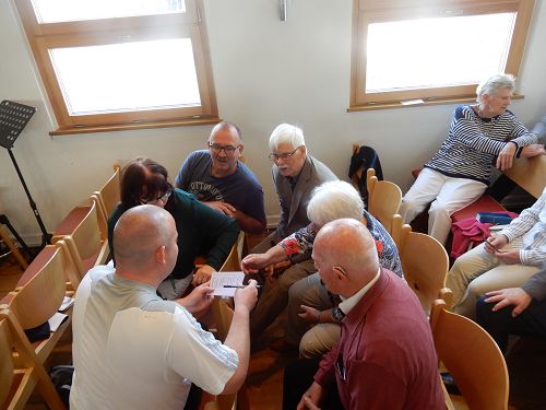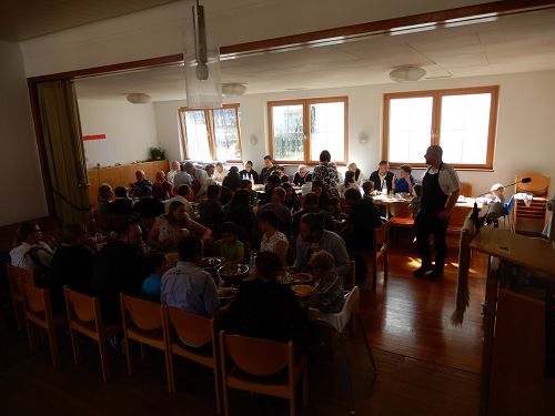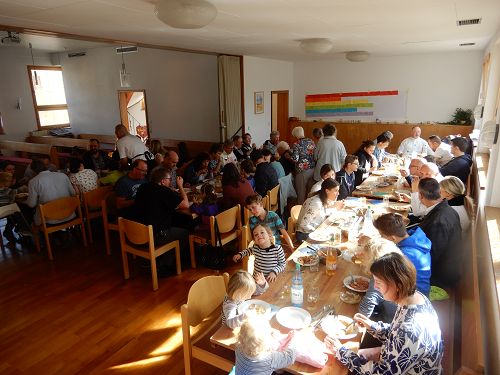 Erntedank beinhaltet ja neben der Freude über dem Empfangenen immer auch die Bereitschaft  von dem Reichtum an die abzugeben, die wenig oder nichts haben. So können wir Brückenbauer der Liebe Gottes werden und dem Vorbild Jesu folgen, der diese Liebe vom Himmel auf die Erde gebracht und uns vorgelebt hat. Als Erinnerung erhielten alle Besucher einen Regenbogenbändel mit Knoten. Bei einem leckeren gemeinsamen Mittagessen, das vom Männerkochteam vorbereitet wurde, klang das Erntedankfest dann fröhlich aus. Herzlichen Dank allen, die zum Gelingen dieses Festtages beigetragen haben.