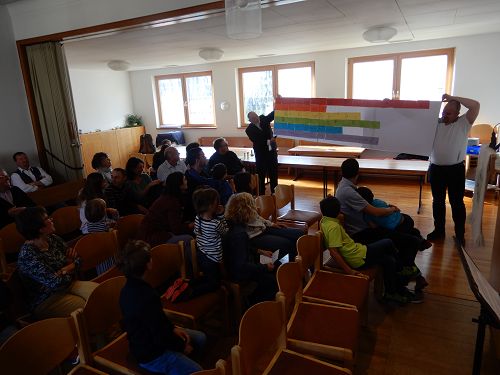 Nachdem alle Zettel auf einem Plakat zusammengetragen waren entstand ein buntes Dank-Bild, das sehr an einen Regenbogen erinnerte. Dieses Bild nahm Pastor Bauer dann in seiner Kurzansprache auch auf: damit ein Regenbogen entsteht braucht es Sonne und Regen, genau wie für eine gute Ernte und damit das Leben auf der Erde wachsen und gedeihen kann.  Er wies dann  auch auf die Bedeutung des Regenbogens in der Bibel, wo Gott ihn als Erinnerungszeichen dafür gab, dass er künftig das Leben auf der Erde nicht mehr vernichten sondern bewahren wollte. Eine Aufgabe in die er uns mit hineinnehmen will.