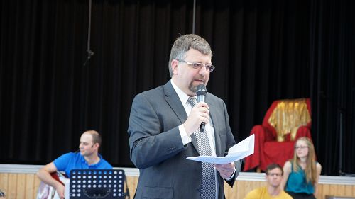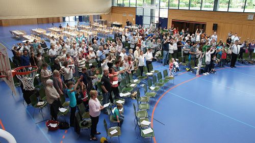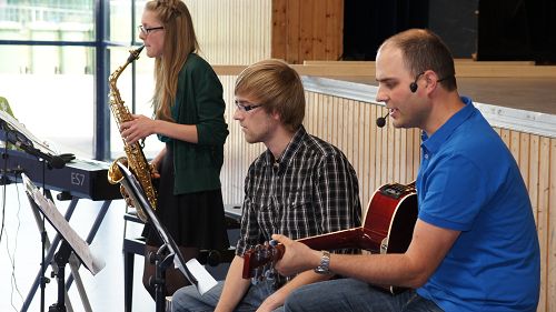 „Was ist eigentlich an Himmelfahrt passiert?“ Dieser Frage ist Pfarrer Johannes Rau beim Gottesdienst in der Sport-und Kulturhalle am 29. Mai in seiner Predigt nachgegangen. Wie so oft war es ein abwechslungsreicher Gottesdienst mit vielen Liedern, begleitet von Cajon, Keyboard, Saxophon und Gitarre. Besonderen Schwung brachten die Kinder vom eigens für diesen Gottesdienst gebildeten Kidzchor herein. Sie begeisterten die Besucher mit Liedern wie „Hier bist Du richtig“, „Bärenstark“ oder „Königskinder“ sowie auch durch ihren Ausdruck und die passenden Bewegungen zu den Liedern.