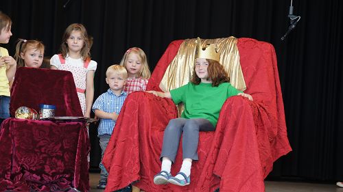 Frau Schäfer von der EmK Vaihingen probierte mit den Kindern aus, wie es ist als König auf einem Thron zu sitzen, Befehle zu geben und Untertanen zu haben, die diese Befehle auch ausführen. Ganz anders jedoch der „Himmelskönig“ Jesus erklärte sie. Er ist gekommen um den Menschen zu dienen und so seine Liebe zu zeigen, indem er sich sogar selbst geopfert hat für uns Menschen. Dass er starb und wiederauferstand wissen wir von Ostern her. Dass er uns dennoch nicht verlassen hat und ganz weit weg im Himmel ist betonte Pfarrer Rau nochmal. Er ist so nicht mehr für uns sichtbar und doch anwesend und nahe auch durch seinen Heiligen Geist.